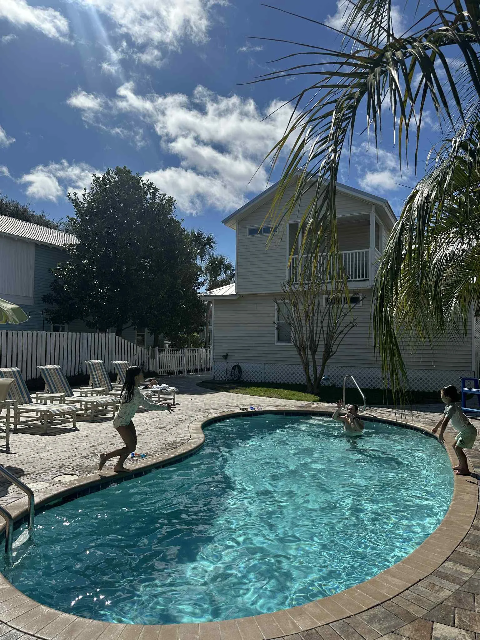 From the moment we walked through the door, it felt like our home. The kids raced to pick their bedrooms, while I set my coffee down on the kitchen counter and took in the open living space. I loved that we had a big, comfy area to gather in—perfect for game nights and family meals—without worrying about thin walls or neighbors right next door. We had plenty of room to spread out, space for the kids to play, and a kitchen where we could cook up family breakfasts before heading to the beach. Having our own outdoor space was such a treat too. We could come back from the beach, rinse sandy toes, and relax outside without the hassle of elevators or long walks through parking garages (the usual condo struggle!). Another perk is having your own private pool which won lots of bonus points with the kids!